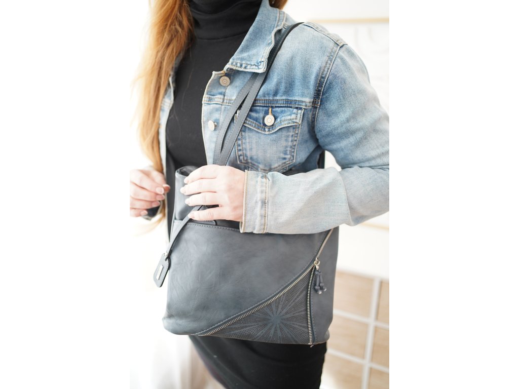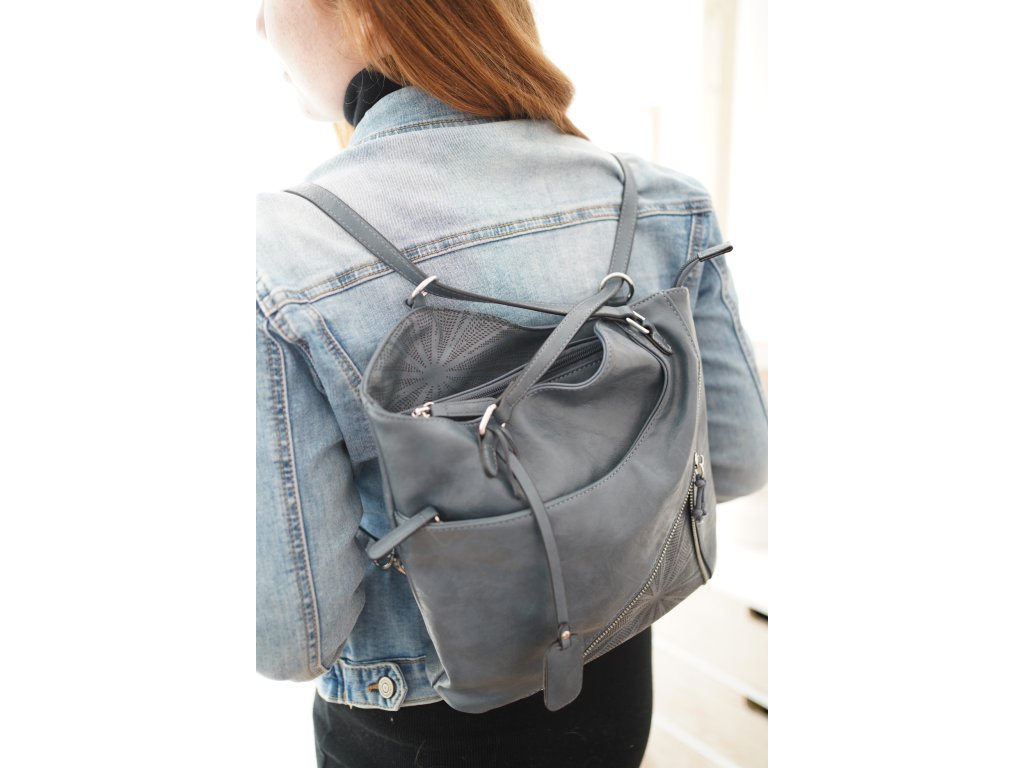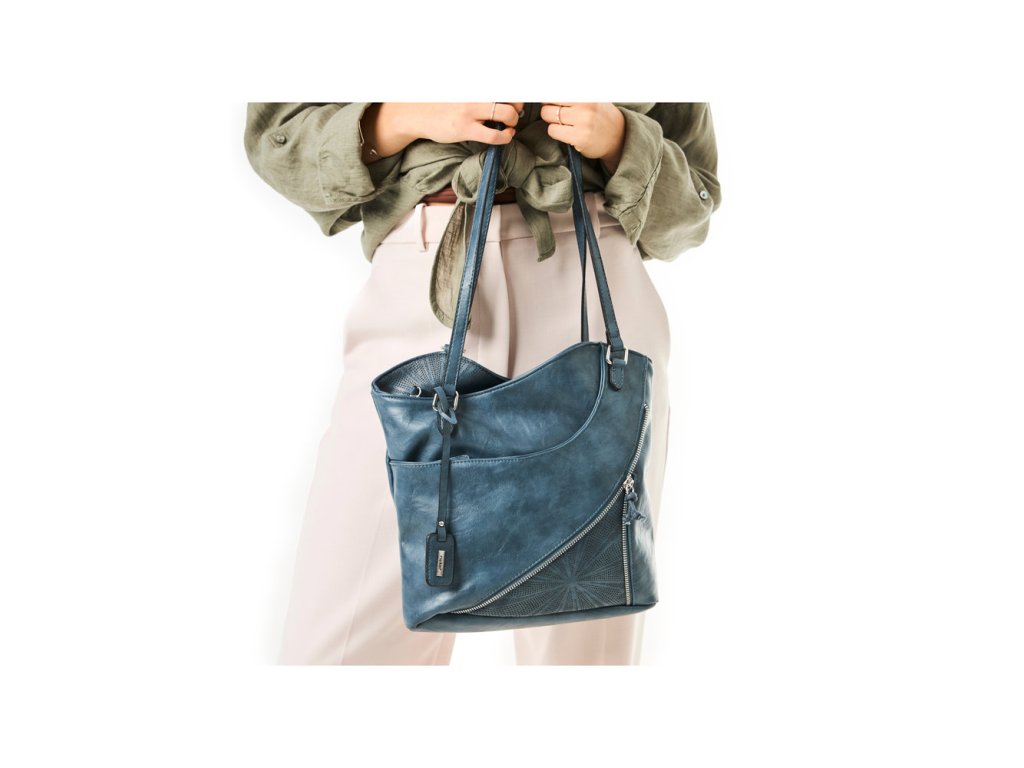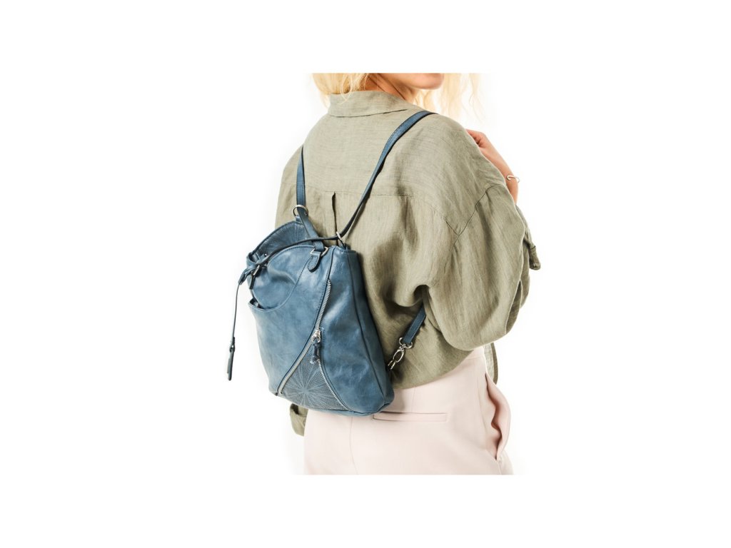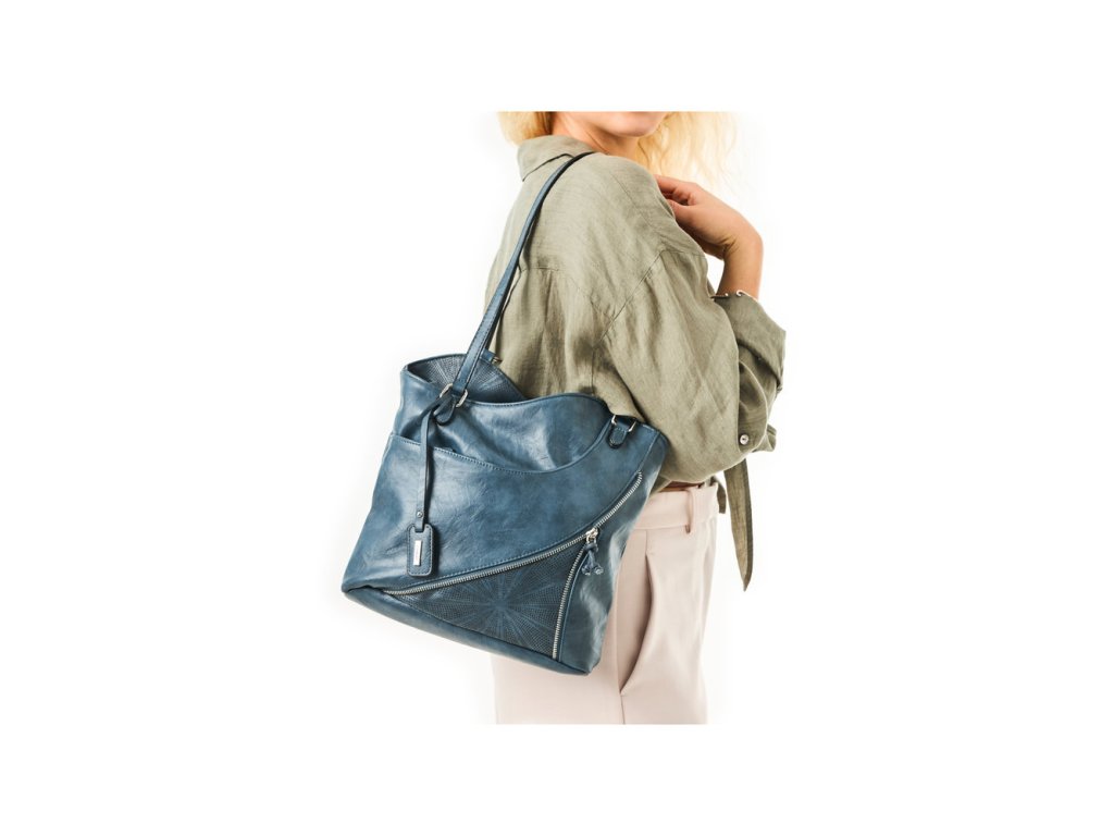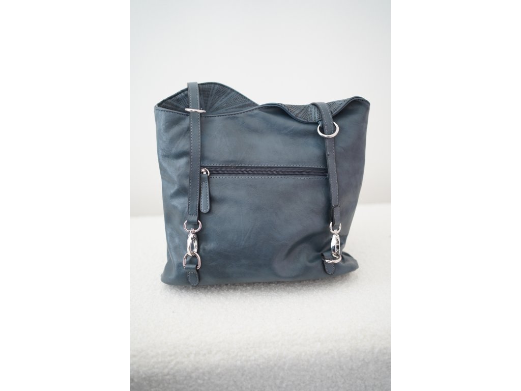 Dámská kabelka 2v1 v elegantní modré barvě s možností nošení jako batoh. Střední velikost, sofistikovaný design s geometrickým vzorem, kovové detaily ve stříbrné barvě a praktické kapsy pro každodenní organizaci.